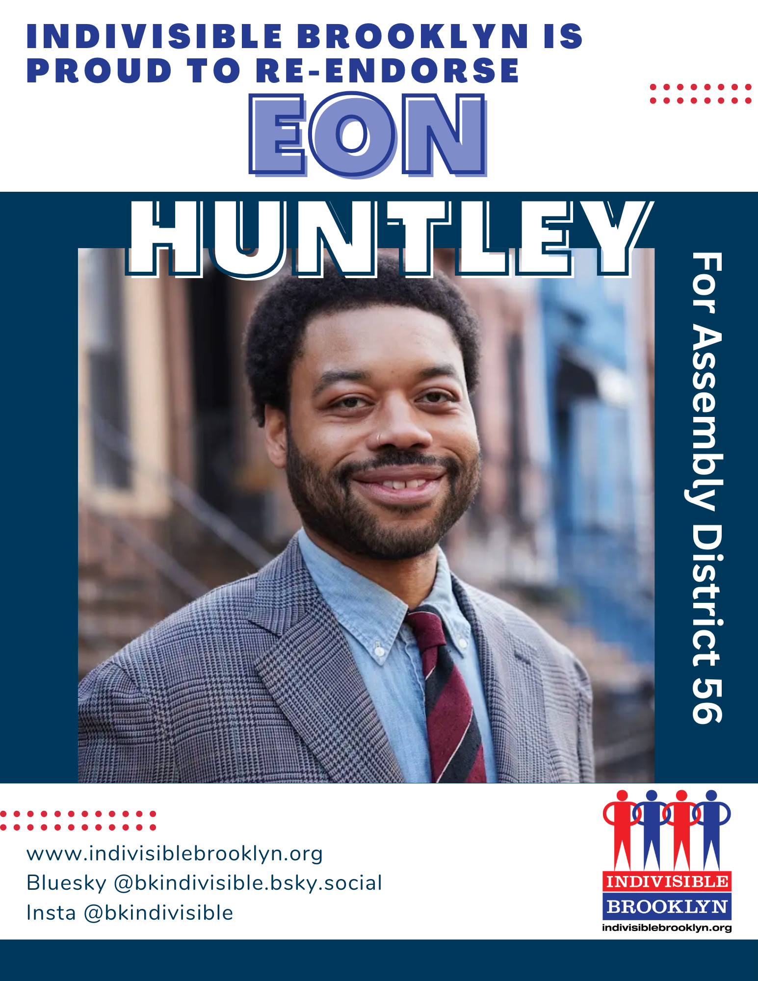 Indivisible Brooklyn is proud to endorse Eon Huntley for Assembly in District 56! As a union leader, PTA president, and community organizer, Eon puts people over profit. Brooklyn deserves elected leaders who’ll fight for us. Eon knows how to fight for our communities and win. Show your support at eonforassembly.com.